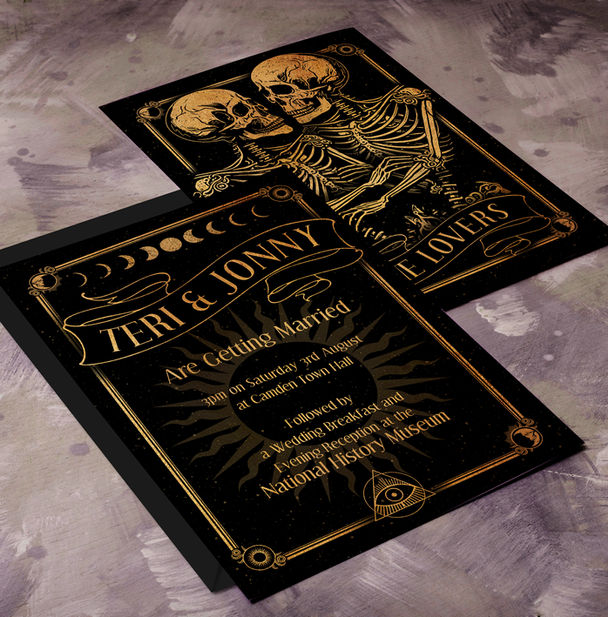 What can be more romantic than two lovers together for eternity. With it's strong 'til death do us part' vibes this black ad gold wedding invitation design is sure to wow your guests.